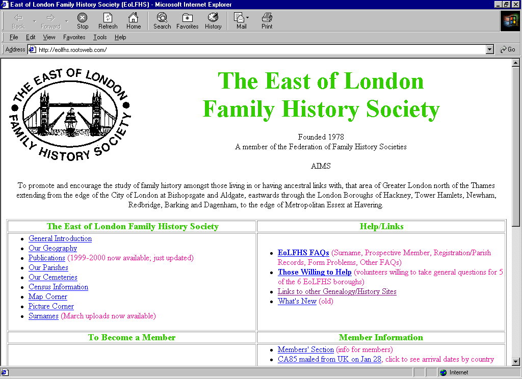 Once the web page has loaded you can go and get your first e-mails (often the ISP will send you a confirmation or welcoming mail). Most browsers have a mail icon on the top tool bar this may have a picture like an open envelope on it. Click this and download your mail. After having downloaded your mail you can then go back to your browser and the adventure begins. The Browser normally has two rows of buttons on it, one with icons which allow you to navigate common features with your mouse and the other has a series of tool bar headings such as File, Edit, View, Favourites (or Bookmarks), Tools and Help. Clicking on any of these displays a drop down list of options you can choose. Under the two rows of buttons there is normally an Address or URL field which is where you type the address of the site you want to connect to. The figure below shows the layout of my Internet Explorer (Version 5) browser and the Address is set as http://eolfhs.rootsweb.com/ This is the address of the East of London Family History Society. The address can be referred to as the URL or (Uniform Resource Locator). Some addresses are entered as www.something.co.uk etc. To go to a new web page. Click in the address or URL box and enter the address of the web site you are interested in then hit return and the web site will be displayed.