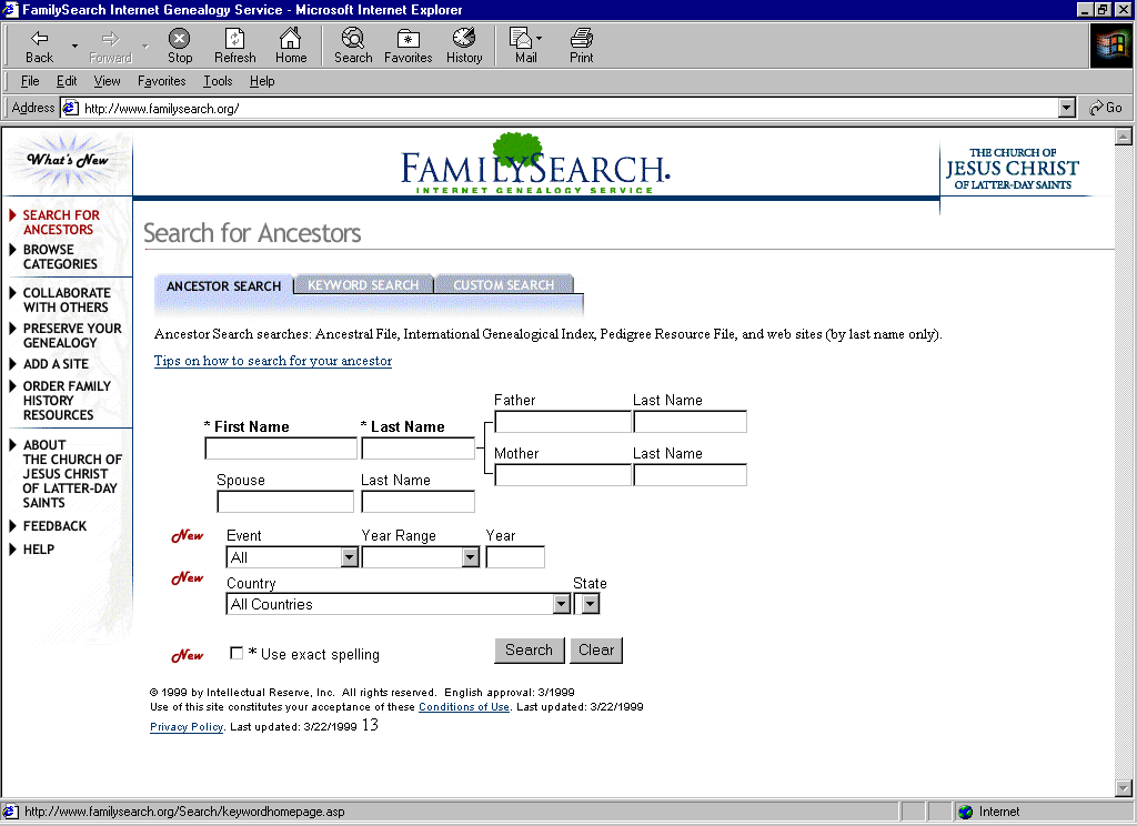 So lets start browsing. I would suggest that a good place to start is the BBC web site which has news and TV listings but also has some very good information about the Internet. The address is www.bbc.co.uk you can learn more about the Internet here and there is a good section on family history at the History zone. Your next address could be our own East of London Family History Society page. Enter http://eolfhs.rootsweb.com/ and you can get into our own site which is run by Dave Jordan. The rootsweb site hosting the EOLFHS pages is a favourite genealogy site and can be found at http://www.rootsweb.com. Click on a link on a web page and you are directed off to another site or place within the same site. Rather than having to type and re-type these addresses into your browser, use the Favourite or Bookmark section to save the sites you like to your own Favourites or Bookmark folders. Click on "add to favourites" and add the address. This will allow you, in future, to click on favourites, find the site you want to visit, click on that with your mouse and the browser will find your site. The screen shot below is that of the Later Day Saints Familysearch site at www.familysearch.org another resource well worth a look whilst you are learning what is available for your research.