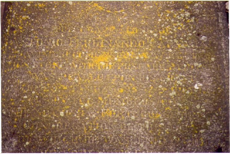 Antonio Ferdinando Carvajal's Grave Stone InscriptionAntonio's Grave Stone (replaced about 80 Years ago). Picture courtesy John and Sue Ferdinando.