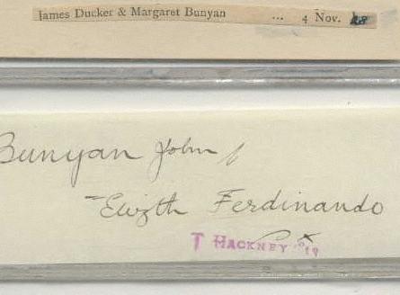 Ferdinando Elizth to Bunyan John 1813 Hackney Middlesex |
