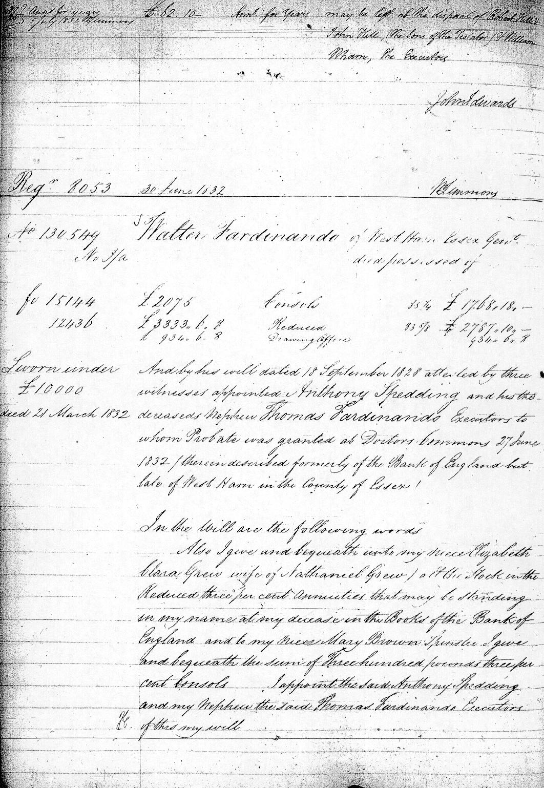 Sworn under £10,000 - Died March 1832 And by his Will dated 18th September 1828 attended by three witnesses appointed Anthony Spedding and his ??? deceased's Nephew Thomas Fardinando Executors to Whom probate was granted at Doctors Commons 27 June 1832. Therein described formerly of the Bank of England but late of West Ham in the County of Essex In the Will are the following words: Also I give and bequeath unto my Niece Elizabeth Clara Grew wife of Nathaniel Grew all the stock in the reduced three percent annuities that may be standing in my name at my decease in the Books of the Bank of England and to my Niece Mary Brown Spinster I give and Bequeath the sum of Three Hundred Pounds three per cent bonsols. I appoint the said Anthony Spedding and my Nephew the said Thomas Fardinando Executors of the my Will.