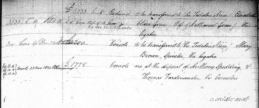 £3333-6-8 reduced to be transferred to the Testators Niece Elizabeth Clara Grew wife of Nathaniel Grew the legatee £300 bonsols to be transferred to the Testator Niece Mary Brown, Spinster. The legatee £1775 bonsols are at the disposal of Anthony Spedding & Thomas Fardinando the Executors.